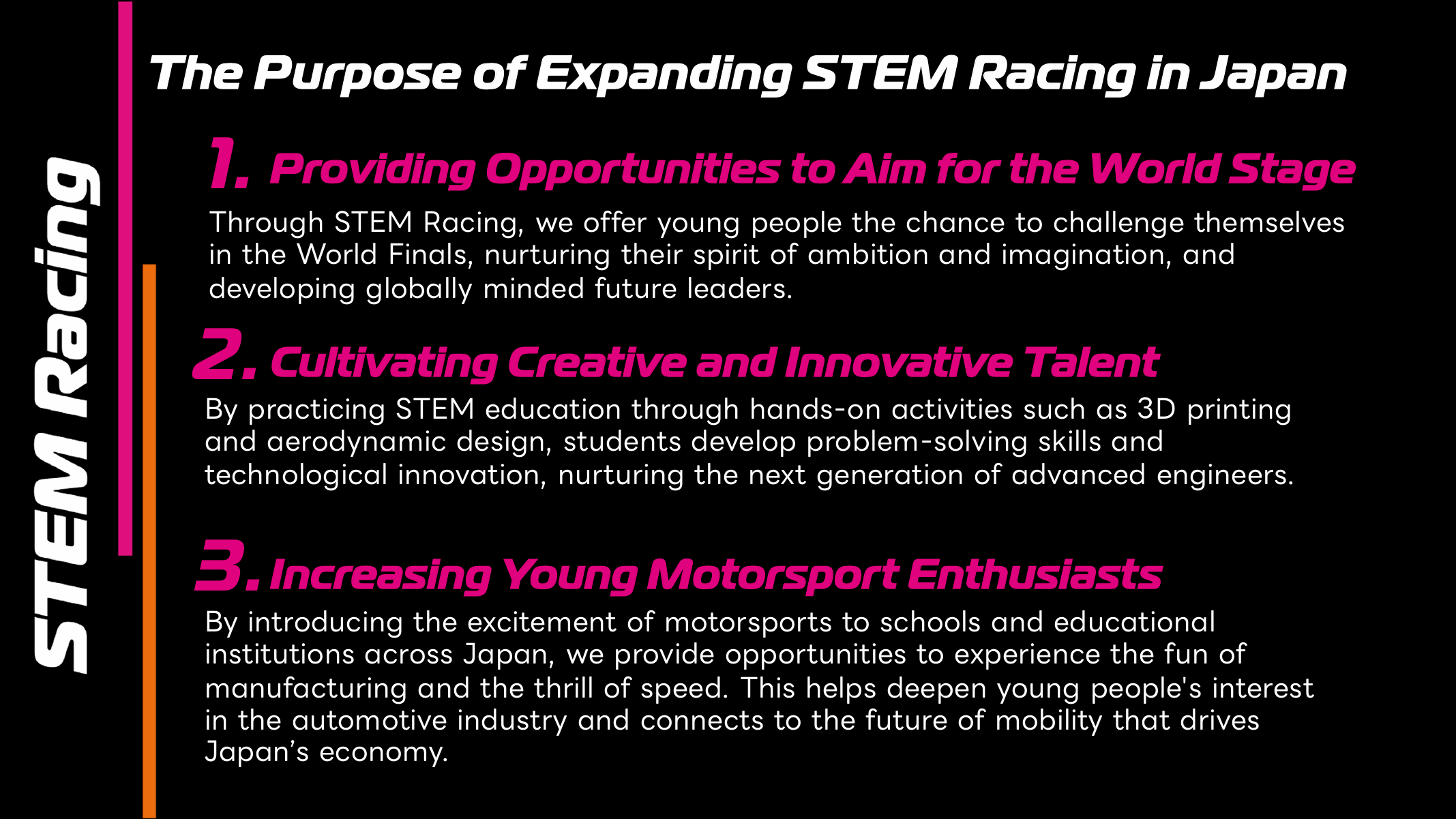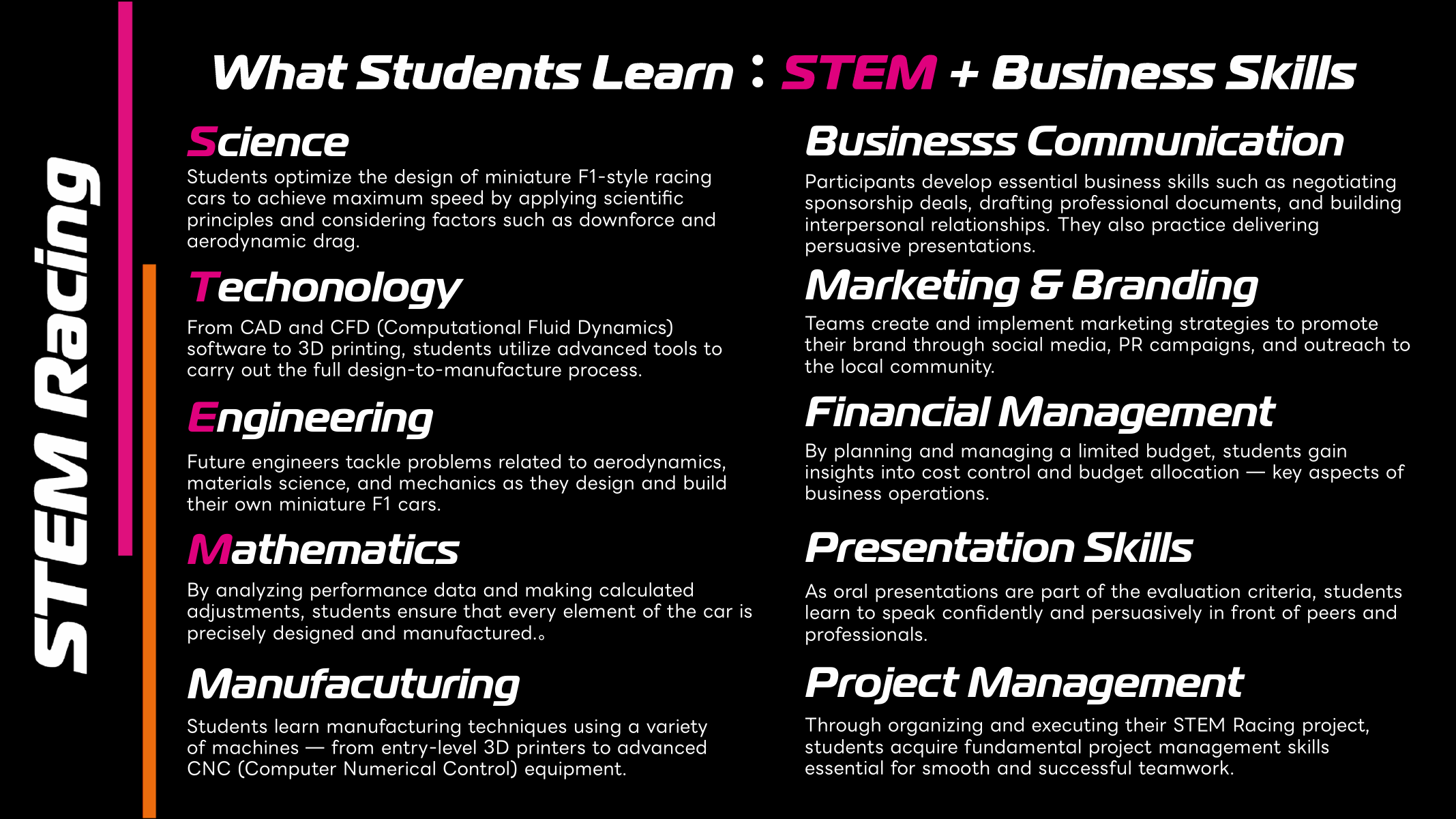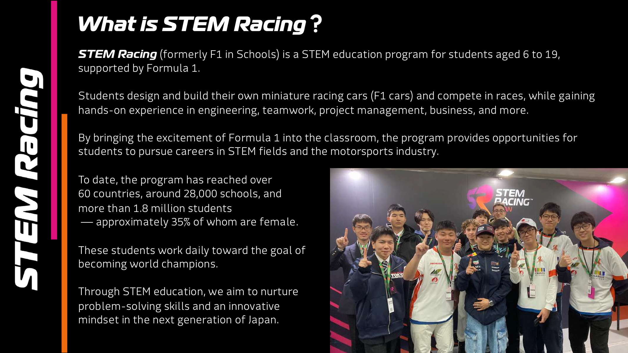 STEM RACING is an international STEM (science, technology, engineering and mathematics) education program officially sponsored by F1, and is a competition of creativity and practical skills that brings together junior and senior high school students from around the world to embody the "Spirit of F1".